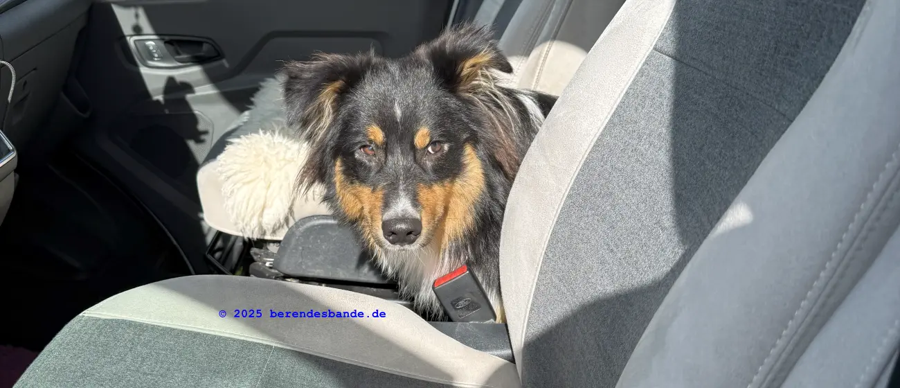 Vor ein paar Tagen haben Herrchen und Frauchen die grüne Hülle von dem Riesenauto gemacht und nachgeguckt, ob es noch da ist. Dann haben sie alle möglichen Sachen in Kisten gepackt und sind damit weggelaufen. Aus sie wiederkamen, waren die Kisten leer. Ich hab schon gedacht, die schmeißen das alles weg, weil sie immer in die Garage gelaufen sind und da stehen die Mülltonnen. Aber sie haben das Alles gar nicht weggeschmissen. Die haben die Sachen in das Riesenauto gepackt, das steht nämlich vor der Garage. Und dann sind alle eingestiegen. Aber ich wollte da nicht rein, das war mir gruselig. Aber als der Snickers und der Devil auch darein gegangen sind, hab ich gedacht, besser einsteigen als zu allein zu Hause bleiben. Es ist ja auch gar nicht so gruselig - ich hatte nur vergessen, dass ich schon einmal mit dem Riesenauto ans Meer gefahren bin. Und jetzt sind wir wieder ans Meer gefahren. Also nicht an das gleiche Meer, aber da, wo wir angehalten haben, waren noch mehr so Autos - nur waren da keine Hunde drin. Da war auch nur ein kleines Meer und wir sind nur einen Tag geblieben und dann weiter gefahren.