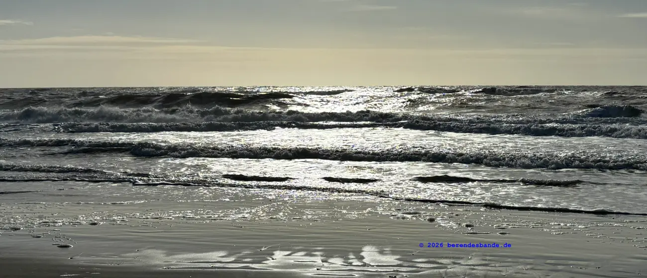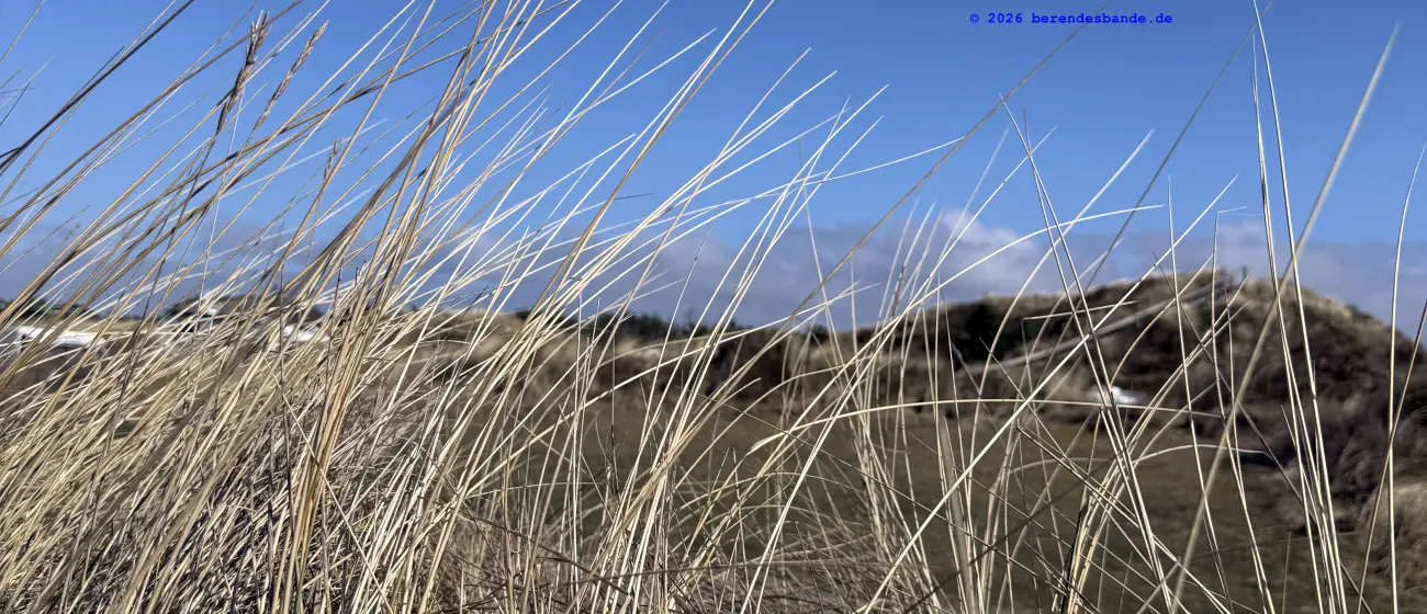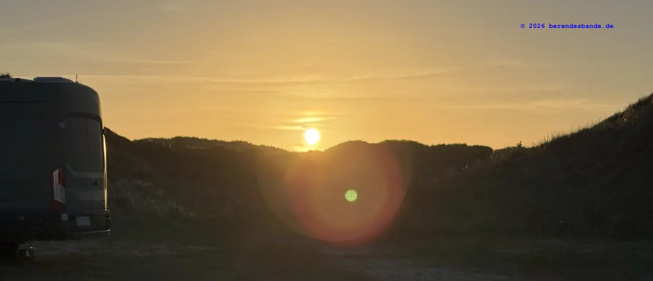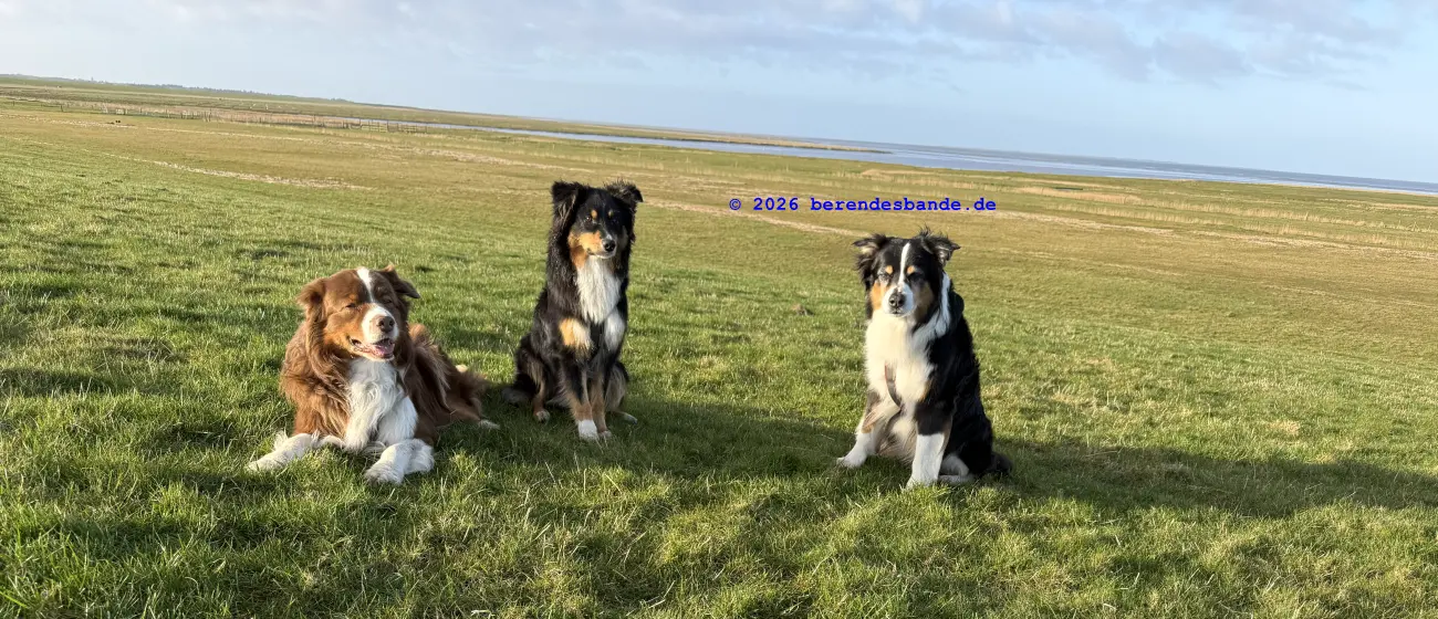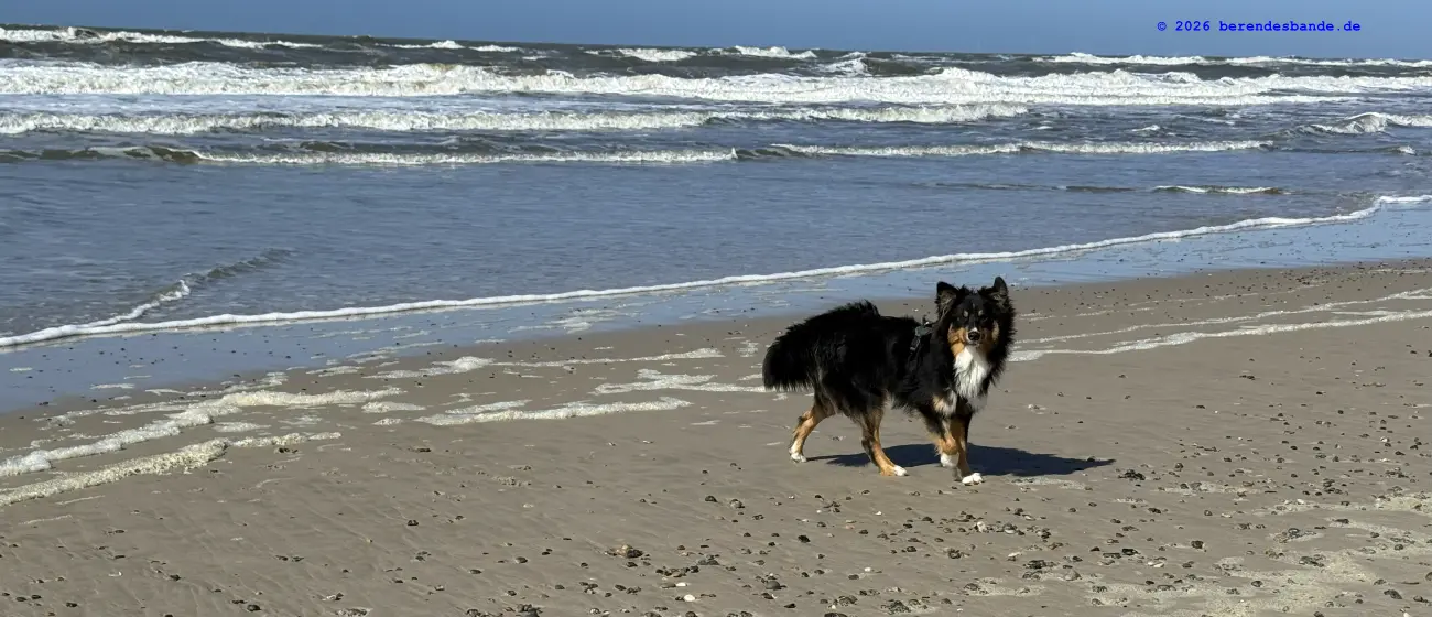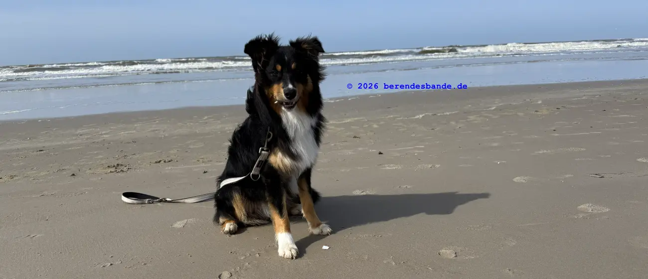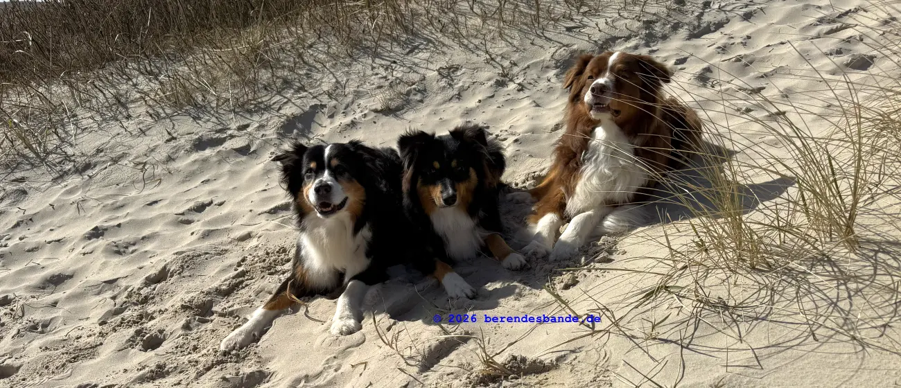 Dann kamen wir an eine andere Wiese und da war - niemand. Wir waren da ganz alleine. Gegenüber von der Wiese war ein Zaun, aber Herrchen konnte den Zaun auf machen, damit alle hinter den Zaun kamen. Dann mussten wir einen steilen Berg aus Wiese raufrennen und oben konnte man das Meer sehen, aber es war schon ziemlich weit weg. Auch auf der Wiese waren wir nur einen Tag, aber dann kamen wir auf einen tollen Abenteuerspielplatz. Ich sag euch, das war super. Von unserem Wohungsauto konnten wir sofort auf den Abenteuerspielplatz gehen, nur 100 m an der Leine laufen und dann ging der Spaß los. Da gab es hohe Berge aus Sand und überall gab es kleine Wege. Es roch nach allem Möglichen, Rehe, Mäuse, Hasen, Vögel und auch Füchse. Ich konnte immer die Berge rauf und runter rennen und alle Spuren suchen. Nach zwei so Sandbergen war da das Meer. Das war toll und laut, wegen der Wellen. Wir sind da manchmal spazieren gegangen, aber der Wind hat immer den Sand weggepustet. Das war nicht schön und hat immer in den Augen gekratzt. Der Devil hatte ein ganz doll rotes Auge und musste immer Tropfen ins Auge haben. Deshalb sind wir meistens nur in den Sandbergen gelaufen, wo die vielen Spuren waren. Herrchen hat immer gepfiffen, wenn ich zu weit weggerannt bin, aber manchmal hab ich ihn einfach überhört. Ist keine gute Idee Herrchen und Frauchen zu überhören. Dafür gibt es keine Leckerchen. Dafür komme ich an die Schleppleine. Die ist nur 10 Meter lang und ich kann nicht mehr durch die Dünen düsen. Nach zwei Tagen durfte ich wieder frei laufen. Ich bin dann immer gleich zurückgelaufen, wenn meine Leute gepfiffen haben.