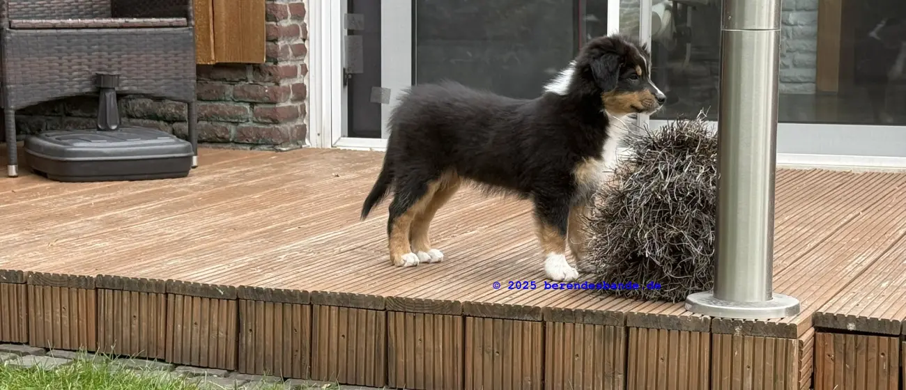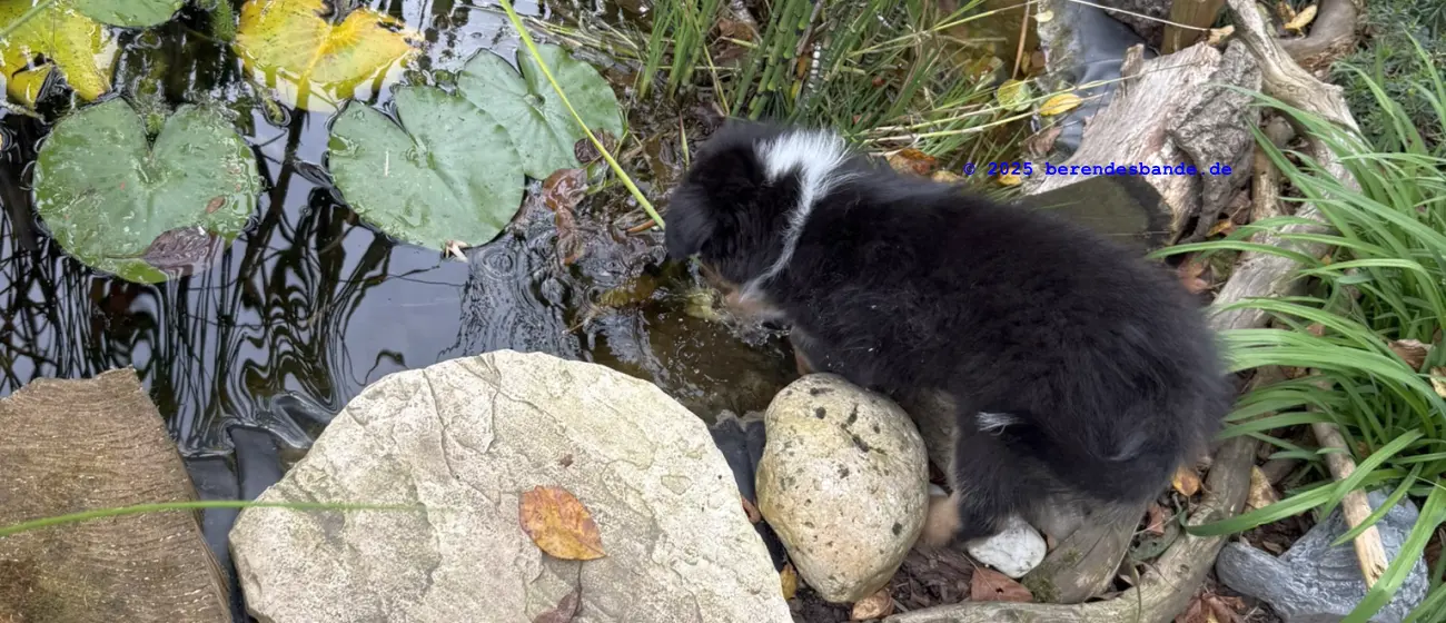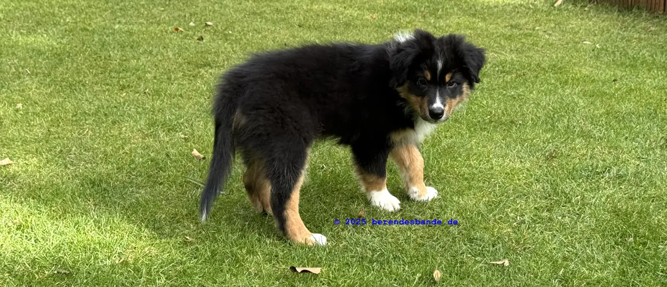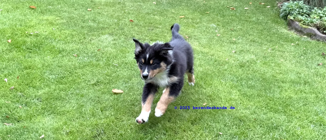 Ich gehöre zur Gattung Rüpel, Abteilung Hosenbeinebeißer - oder wie meine Leute sagen, ich bin ein Australian Shepherd Rüde. Ich bin jetzt 10 Wochen alt und wohne seit neustem hier - also bei der Berendesbande. Da wohnen noch Frauchen und Herrchen und der Devil und der Snickers - der sieht fast so aus wie ich, nur ein kleines bisschen größer. Eigentlich ist es ganz cool hier. Mit dem Devil kann ich spielen, Herrchen und Frauchen bringen mir ein paar Kunststücke bei - dabei kann ich auch schon selbst welche. Ich kann die Tischbeine anknabbern, oder die Körbchen von Devil und Snickers, ich kann Blumen aus Frauchens Blumenbeet ausbuddeln und die Blätter aus dem Teich im Garten fischen. Gut, manchmal falle ich dabei in den Teich, aber die Blätter bringe ich trotzdem mit raus. Aber ich glaube diese Kunststücke mögen meine Leute nicht so sehr. Die lernen mir so einen Quatsch wie hinsetzen, hinlegen oder ganz schnell zu ihnen laufen. Zugegeben, diese Dinge machen auch Spaß, besonders weil ich immer Leckerchen abstauben kann, wenn ich es gut mache. Also, für in die Hosenbeine zwicken hab ich noch kein Leckerchen bekommen. Vielleicht muss ich mehr üben, damit es besser klappt.