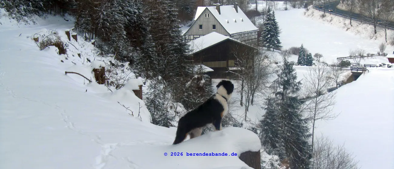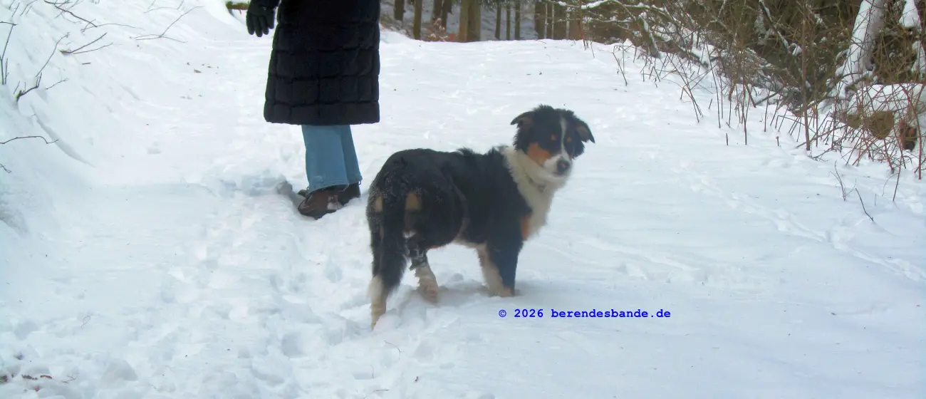 Am nächsten Tag haben Verena und Matthias ihre komischen Schuhe angezogen und wir haben die auf einen Berg raufgefahren. Da haben die die Latten und Stöcke mitgenommen und sind weggelaufen. Mit Frauchen und Herrchen bin ich dann gaaaannnnzz lange spazieren gegangen, im Wald, mit richtig viel Schnee. War schon schön, könnt ihr auf den Fotos gucken. Nachmittags haben wir die beiden wieder eingesammelt. Die waren verfroren, besonders Verena - tja, so ein Fell ist eben manchmal doch ganz gut. Abends sind wir dann wieder zu so einem Mc Doof gegangen. Aber da war es viel schöner, mit Teppich auf dem Boden und man musste sich das Essen auch nicht selber holen. Man bekam es an den Tisch gebracht. Ich hab unter dem Tisch geschlafen, der Tag war sooo anstrengend.