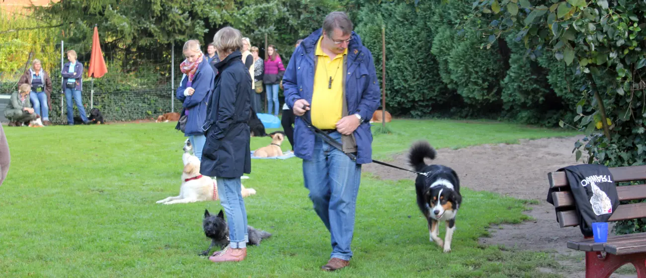 Einmal pro Woche treffen wir uns im Hundegarten und üben. Da kommen dann auch noch andere Hunde mit ihren Menschen hin. Das mit bei Fuß gehen, mit und ohne Leine können wir schon ganz lange. Jetzt müssen wir noch zusammen mit unserem Menschen über einen Stock springen. Oder ich muss mit Herrchen in der Mitte stehen und die anderen Menschen und Hunde kommen auf uns zu, bis sie ganz nah sind. Das macht mir gar nix aus, Herrchen auch nicht.