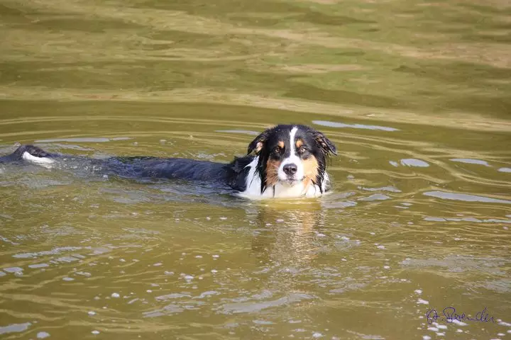 Dann waren wir da, auf einem Bauernhof. Da waren aber keine Tiere, Hühner oder Rinder. Da waren Leute von der Hundeschule, die Trainer und auch die Hunde - und der Buddy war auch da. Den kenn ich schon seit ich ein Welpe war. Also die Leute und die Hunde von der Hundeschule haben sich da getroffen und die ganzen Hunde konnten da rumlaufen, spielen und toben. Die Menschen haben sich unterhalten und gegessen. Dann sind wir alle zusammen noch eine kleine Runde gegangen - echt toll, es war nämlich voll dunkel. Danach sind wir in ein Zimmer gegangen, wo wir schlafen konnten, also Frauchen und Herrchen und ich. Die Anderen haben bestimmt auch irgendwo geschlafen, denn am nächsten Morgen waren sie alle noch da. Nach dem Frühstück sind wir mit Jutta und Werner eine große Runde gelaufen. Immer an einem Fluss lang. Zwischendurch konnten wir da auch schwimmen gehen, die Hunde meine ich. Ich glaub, den Menschen war es zu kalt. Später kam die Sonne und da wurde es auch wieder wärmer. Wir konnten fast die ganze Zeit ohne Leine laufen, das war super. Es waren 30 Menschen und 40 Hunde mit. Da war richtig was los.