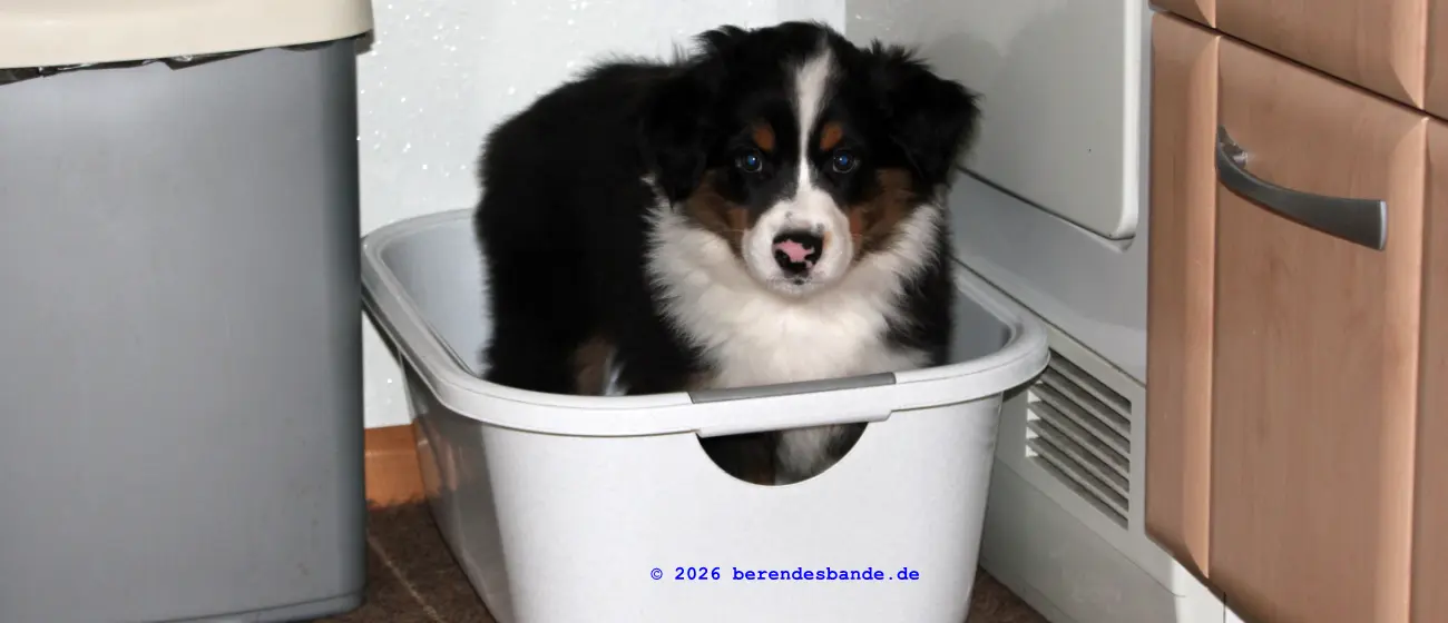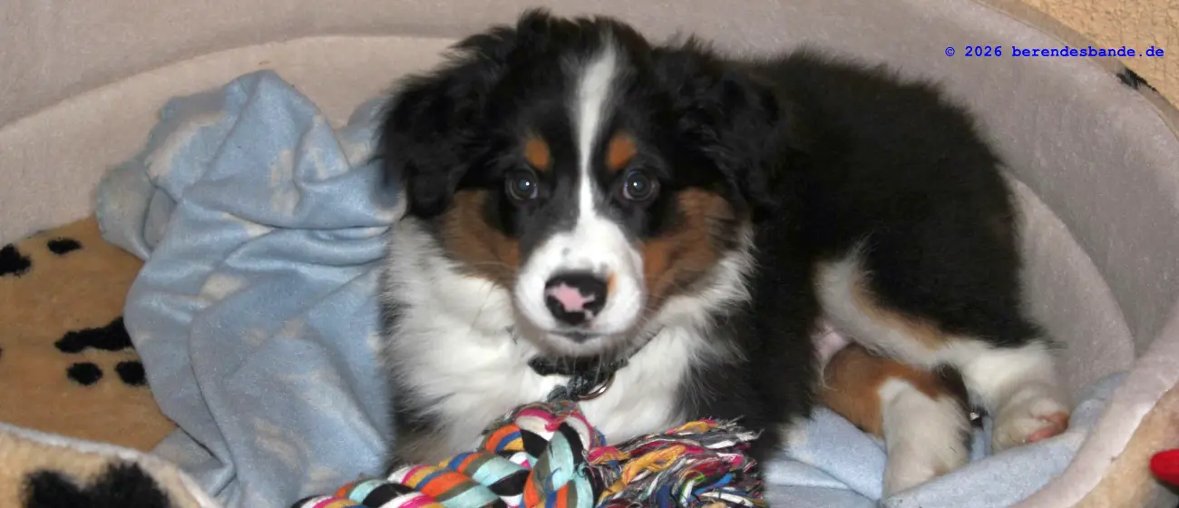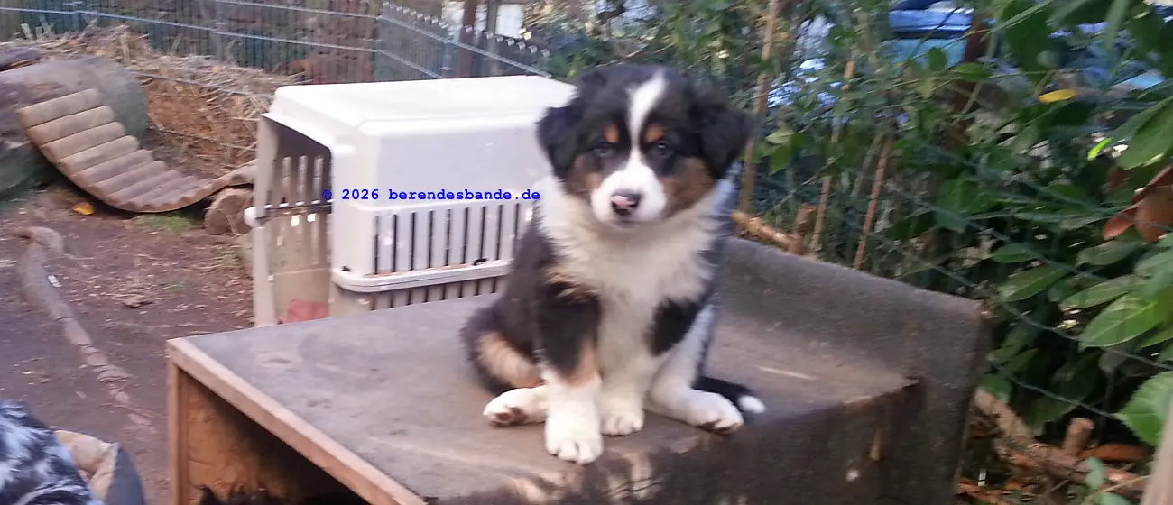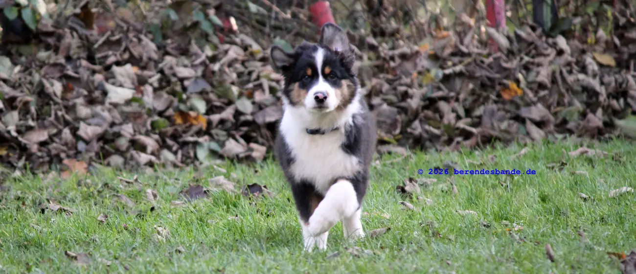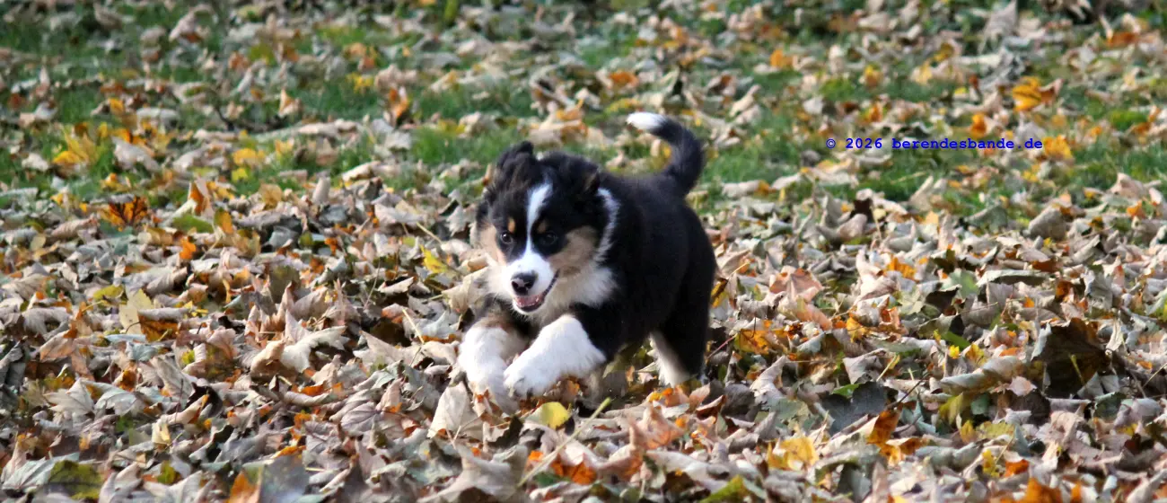 Ich spiele viel lieber mit den Hunden draußen im Wald. Das macht super viel Spaß. Und samstags gehen wir zum Welpentreff. Da treffe ich Nuka, der ist auch ein Australien Shepherd, so wie ich, nur eine Woche älter. Und Anton ist auch da und Barney und - ach ich kann mir die ganzen Namen noch gar nicht merken. Aber wir haben da immer viel Spaß. Erst üben wir ein paar Sachen und dann können wir rumtollen. Danach machen wir noch ein paar Kunststücke, über eine Rampe laufen, oder durch einen Tunnel. Das ist cool und ich mach sowas gerne. Am Ende bin ich immer müde und muss mich ausruhen.