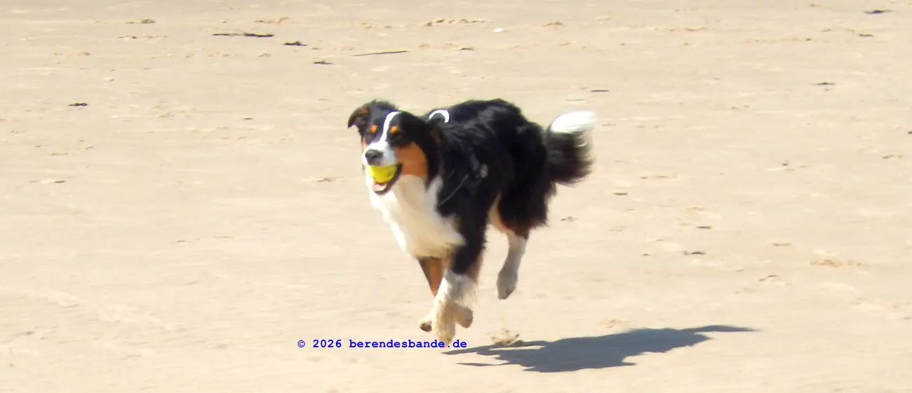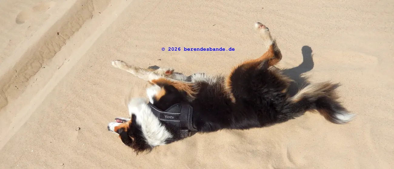 Wir haben schöne Spaziergänge gemacht und waren am Strand. Da konnte ich mich toll im Sand rekeln und Löcher buddeln. Benjamin und Verena waren auch ein paar Tage da und die Oma, die war die ganze Zeit mit. Oma hat einen Vogel – ich meine, so einen richtigen Vogel, der in so einem Drahtkasten sitzt. Der war auch mit, der Vogel mit Drahtkasten. Der stand während der Fahrt auf dem Rücksitz im Auto. Als ich mir von hinten aus dem Kofferraum den Kerl mal genauer angucken wollte und mich am Gitter vorbeiquetschen wollte, hat Oma fast einen Herzinfarkt bekommen. Dabei bin ich ganz lieb, ich wollte nur mal gucken…