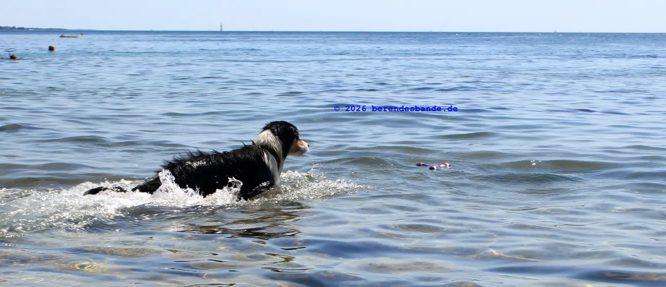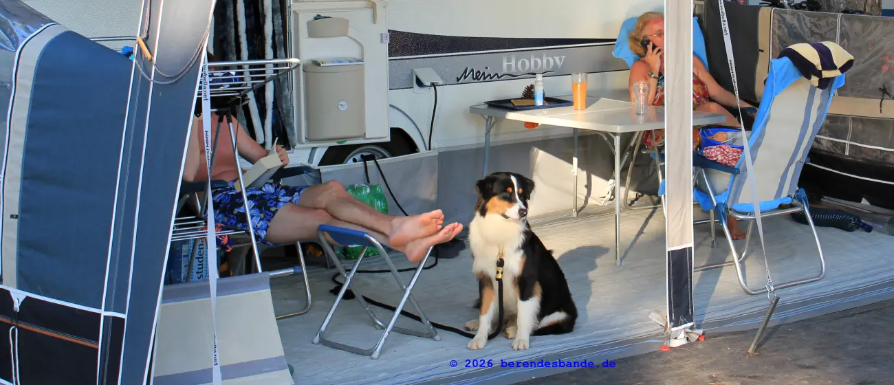 Aber die Hundeschule hat auch Sommerferien. Auch wenn die Schulkinder jeden Tag zur Schule gehen und die Hundeschule nur einmal in der Woche ist. Aber in diesen Sommerferien muss man nicht nur nicht in die Schule, sondern die Erwachsen gehen auch nicht zur Arbeit. Herrchen und Frauchen sind den ganzen Tag da und ich darf fast überall mit hingehen. Und wenn dann Sommerferien sind, dann fahren die Menschen in Urlaub, d.h. sie packen alles Mögliche ein und fahren ganz weit von zu Hause weg. Unser Rudel hat das auch gemacht. Wir haben wieder diesen Wohnwagen vollgepackt und sind ganz weit gefahren. Wir standen direkt am Wasser. Und in den Sommerferien gehen die Menschen dann auch im Wasser schwimmen. Ich weiß nicht, warum man erst ganz weit fahren muss, um schwimmen zu gehen. Ich springe ja schon mal in die Ruhr und schwimme, da sind wir in 10 Minuten, aber in den Sommerferien gehört das wohl dazu, erst zwei Tage mit dem Auto ans Wasser zu fahren. Gut, das Wasser in den Sommerferien war viel wärmer als das Wasser in der Ruhr. Wahrscheinlich liegt das daran, dass die Menschen kein warmes Fell haben.