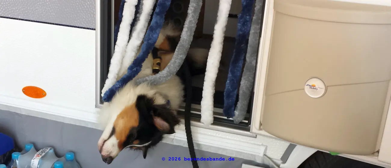 Weil es in den Sommerferien tagsüber so warm ist, haben wir in unserem Wohnwagen einen Kaltluftföhn. Ich weiß nicht genau wie das Ding heißt, es ist eingebaut in die Sitzbank, funktioniert wie ein Föhn, nur das eben kalte Luft aus dem Pusteloch kommt und nicht warme, wie beim Föhn. Das hat mir gut gefallen. Ich konnte mich in den Eingang legen und meinen Bauch in den Pusteföhn halten. So hab ich alles mitbekommen, was draußen los war und konnte trotzdem super dösen. Meine Leute waren den ganzen Tag draußen. Auch Benjamin, Verena und Matthias haben uns besucht in den Sommerferien. Benjamin habe ich in einer großen kühlen Halle abgeholt. Da waren ganz viele Menschen mit Koffern. Die Menschen kommen zu einem Flughafen mit fliegenden Autos, naja mit ziemlich großen Autos, die fliegen können. Herrchen sagt, dass geht viel schneller als Autofahren, nur leider kann man da keine Wohnwagen mitnehmen. Und Hunde dürfen nicht zu den Menschen ins Auto, die müssen im Kofferraum reisen. Das mach ich in unserm Auto ja auch so, nur kann man aus dem Kofferraum der fliegenden Autos nicht rausgucken. Das ist doof. Dann lieber Auto fahren. Na, jedenfalls hab ich mich ganz viel gefreut als ich Benjamin gesehen habe.