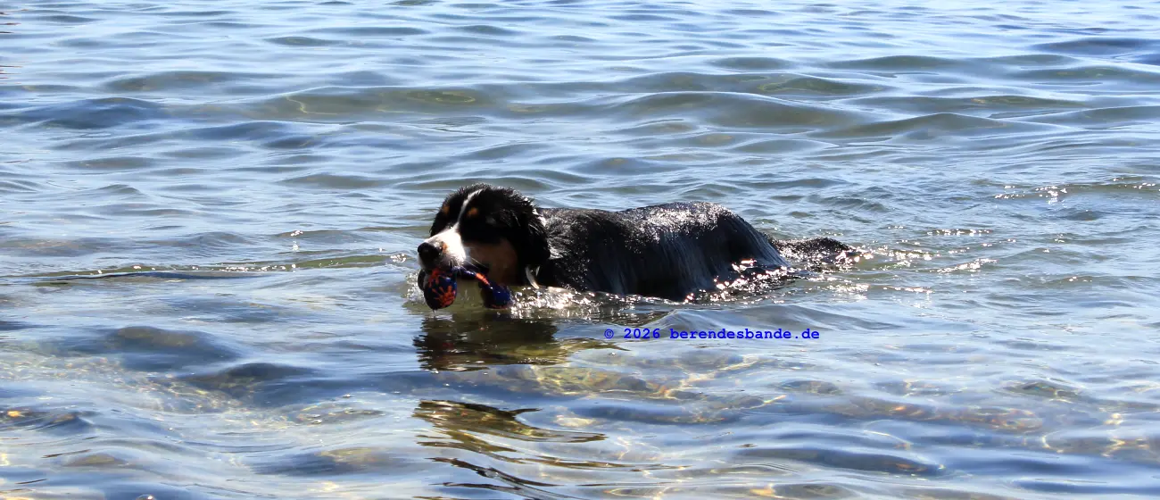 Mit Benjamin und Herrchen bin ich dann auch richtig schwimmen gegangen. In dem Wasser am Campingplatz. Benjamin hatte einen Schwimmstern. Den hat er mir ganz nah vor die Nase ins Wasser gelegt und ich hab den dann ins Maul genommen an Land gebracht. Die beiden haben den Stern immer weiter ins Wasser geworfen und auf einmal konnte ich nicht mehr mit den Füßen auf dem Boden stehen. Da bin ich einfach geschwommen. Ich wusste gar nicht, dass ich das kann. Kann ich aber gut und es hat mir viel Spaß gemacht, den Schwimmstern aus dem Wasser zu fischen. Nach den Schwimmausflügen war ich immer ganz müde. Aber weil es in den Sommerferien ja so schön warm draußen ist, war ich nach dem Schlafen schon wieder trocken. Mit nassem Fell durfte ich übrigens nicht vor den Kaltföhn. Frauchen hat gesagt, dass ich mich sonst erkälte.