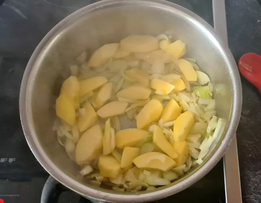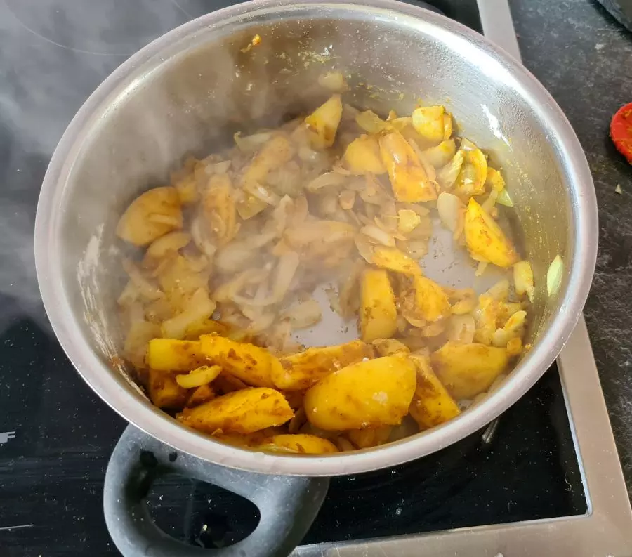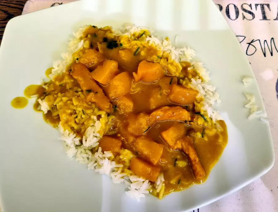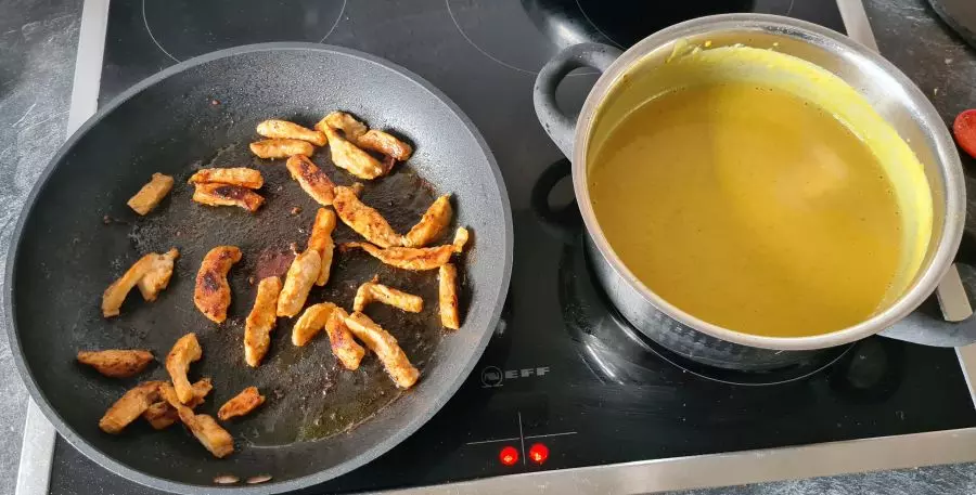 Die Zwiebeln und den Apfel schälen und grob zerteilen. Die Paprika entkernen und in kleine Stücke schneiden. Etwas Öl in einem Topf auf mittlerer Hitze erhitzen und Zwiebeln und Apfel darin braten. Die Zwiebeln nur glasig andünsten. Dann das Currypulver und das Mehl dazugeben. Anschließend mit Wasser aufgießen und gut durchrühren. Etwas Salz zugeben und 20 Minuten köcheln lassen. Dann vom Feuer nehmen und mit dem Mixer pürieren. Den Schmand unterrühren, das Fleisch zugeben und bei kleiner Flamme warmhalten. Die Paprika und die Tomaten in in die Sauce geben. Mit Salz Currypulver und Sojasauce abschmecken. Den Koriander und das Schnittlauch fein hacken und zugeben.
