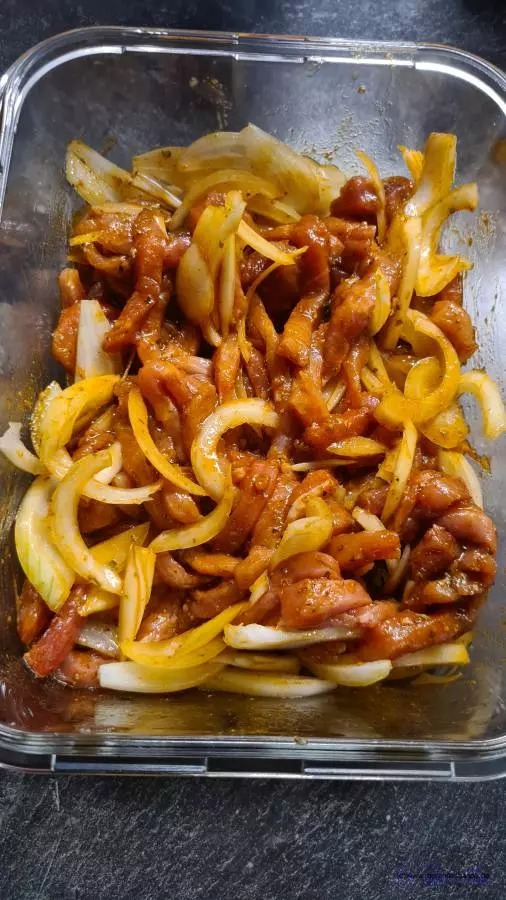 Das Fleisch in schmale Streifen schneiden. Die Zwiebel schälen und in dünne Streifen schneiden. Den Knoblauch schälen und durch die Presse in eine Tasse drücken. Olivenöl, Paprika, Salz, Kreuzkümmel, Majoran und den Zitronensaft in die Tasse geben und alles gut durchrühren. Das Fleisch in eine Schale geben und mit der Gewürzmischung übergießen. Eine Zwiebel schälen und in dünne Streifen schneiden, dann zum Fleisch geben. Alles gut verrühren und über Nacht im Kühlschrank marinieren.
