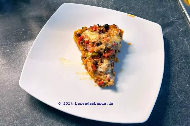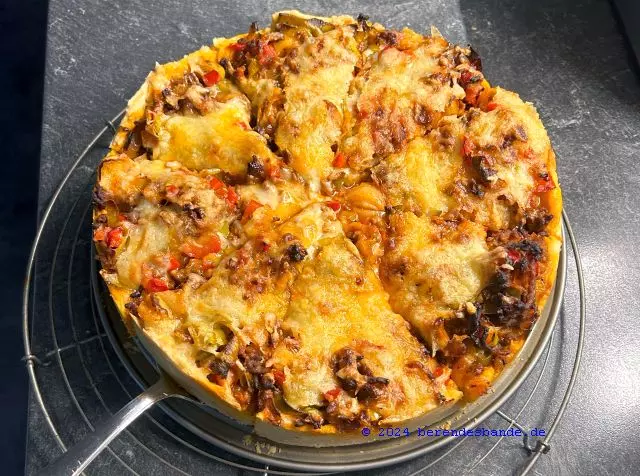 In der Zwischenzeit die Margarine mit einem Teelöffel Salz, dem Mehl und dem Wasser zu einem festen Teig kneten. Den Backofen (Umluft) auf 160 Grad vorheizen. Eine Springform einfetten und den Teig hineingeben. Mit den Fingern gleichmäßig in der Form verteilen und einen etwa 2 cm hohen Rand erzeugen. Den Pfanneninhalt in die Form geben und verteilen. Mit Käse bestreuen und 35 Minuten backen.