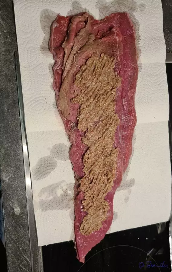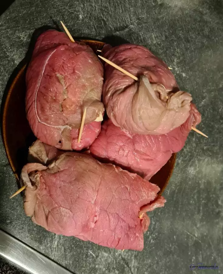 Die Zwiebel und den Knoblauch schälen und grob zerteilen. Die Gurken grob zerteilen. Die Petersilie fein hacken. Aus Knoblauch, Zwiebel, Senf und Meerrettich mit dem Pürierstab eine Paste herstellen. Das Hackfleisch pfeffern und salzen und die Paste dazugeben. Alles gut mit einer Gabel vermengen. Die Rouladen waschen und abtupfen. Von der Innenseite pfeffern und salzen. Dann das Hackfleisch dünn auf die Roulade streichen. Mit 1,5 Scheiben Käse je Roulade belegen. Die Rouladen vom schmalen Ende her aufrollen und mit Zahnstochern fixieren. In einem Topf das Öl erhitzen und die Rouladen kurz von allen Seiten scharf anbraten. Dann die Hitze reduzieren und mit dem Rotwein ablöschen. Die Gemüsebrühe zugeben und 1,5 Stunden auf kleiner Flamme kochen lassen. Ab und zu die Rouladen wenden. Dann die Rouladen aus dem Topf nehmen, die Speisestärke mit etwas Wasser auflösen und in die Soße geben. Das Ganze kurz aufkochen lassen. Mit Pfeffer Salz, Creme Fraiche, Petersilie und Rotwein abschmecken. Die Rouladen wieder in die Soße geben.