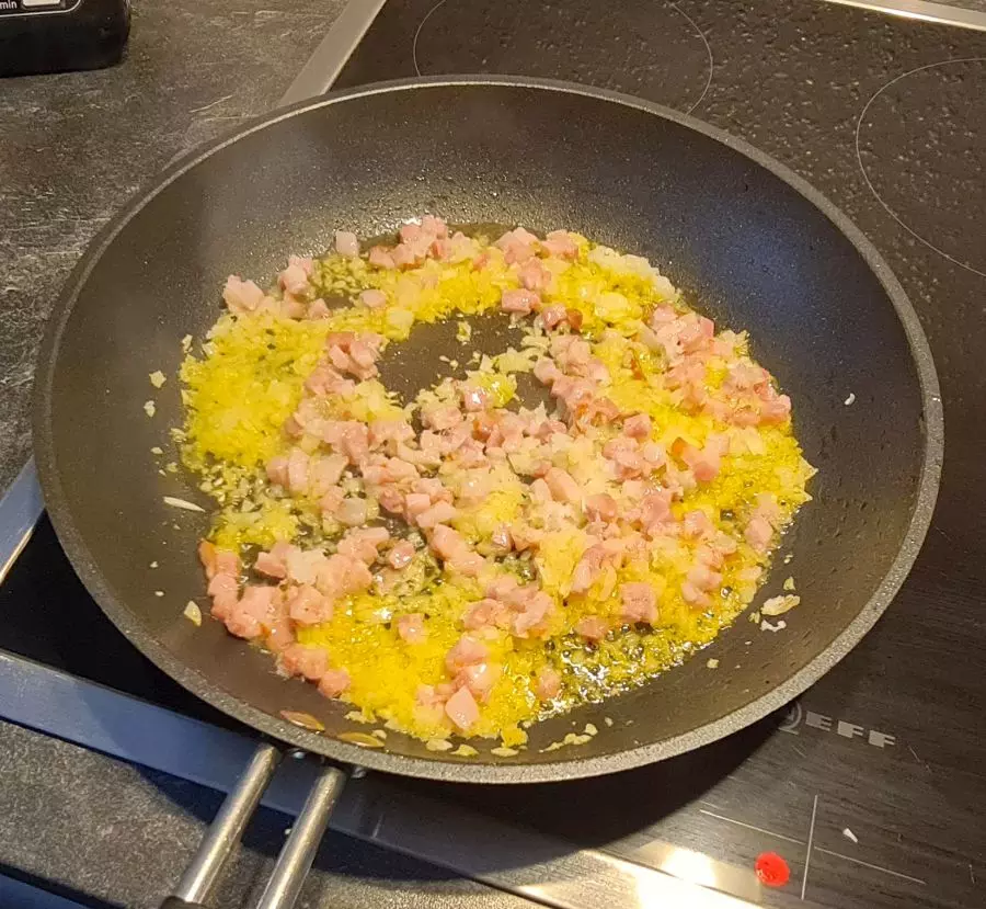 - 150-200 g durchwachsener Speck gewürfelt oder roher Schinken