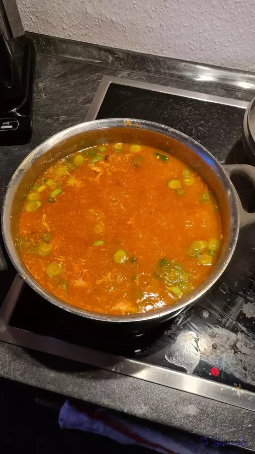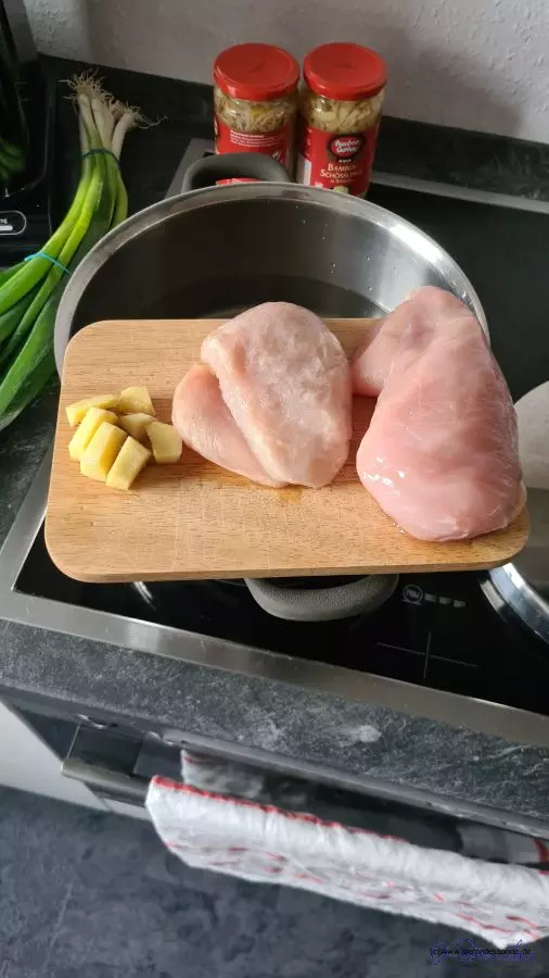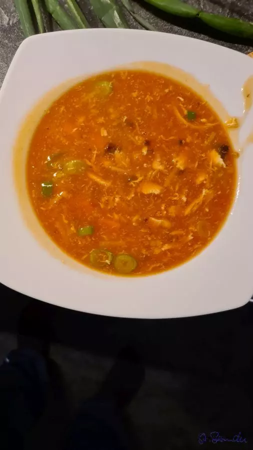 Das Fleisch in kleine Stücke reißen. Das geht ganz gut mit einer Gabel. Dann kommet es mit in die Pfanne. Den Pfanneninhalt in den Ingwersud geben, Reisessig, Honig und Sesamöl zugeben und zum Kochen bringen. Mit Salz, Honig und Sambal abschmecken. Die Möhren zufügen und 10 Minuten mit kochen lassen. Die Speisestärke in etwas Wasser auflösen und unter Rühren in die Suppe geben.