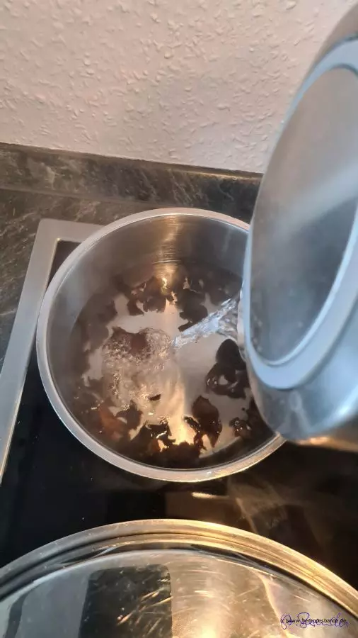 Den Ingwer schälen und in Scheiben schneiden. In einem großen Topf 2 Liter Salzwasser zusammen mit dem Fleisch und dem Ingwer 30 Minuten kochen. Das Fleisch aus dem Sud nehmen und abkühlen lassen. Den Ingwer aus dem Sud nehmen und entsorgen. Die Mu Err Pilze mit kochendem Wasser übergießen und bei kleiner Flamme 30 Minuten köcheln lassen. Das Pilzwasser abgießen und die Pilze zerkleinern.