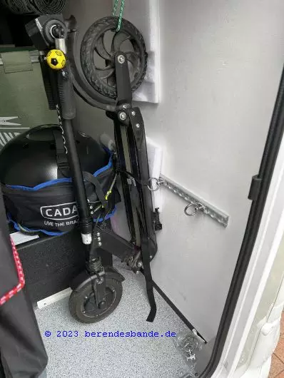 An der linken Garagentür haben wir Platz geschaffen für unsere beiden E-Scooter. Diese stehen ebenfalls hochkant auf dem Vorderrad an der Rückwand. Damit sie während der Fahrt an dieser Stelle bleiben, habe ich eine Airlinerschiene an der Rückwand verklebt und verschraubt. Mit zwei kurzen Spanngurten bleiben die Roller in Position. Zusätzlich habe ich an der Auflage der klappbaren Regalböden eine Zurröse angebracht. Ein Expandergummi sorgt für mehr Stabilität. Auf der gegenüberliegenden Seite, also an der Trennwand zur Dusche, habe ich ebenfalls eine Airlinerschiene angebracht, genauso wie eine Zurröse an der Auflage des Regalbodens. Hier habe ich eine Tasche für unsere vier Auffahrkeile befestigt. Hier ist außerdem die Gardena Schlauchbox befestigt. Unser Gasgrill steht auf dem Klimagerät und wird mit einem Expandergummi an der Airlinerschiene gehalten. Durch diese Aufteilung kann ich auf alle Gegenstände, die in der Garage untergebracht sind, problemlos zugreifen.