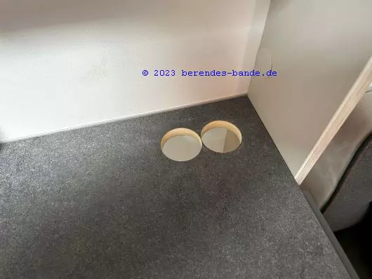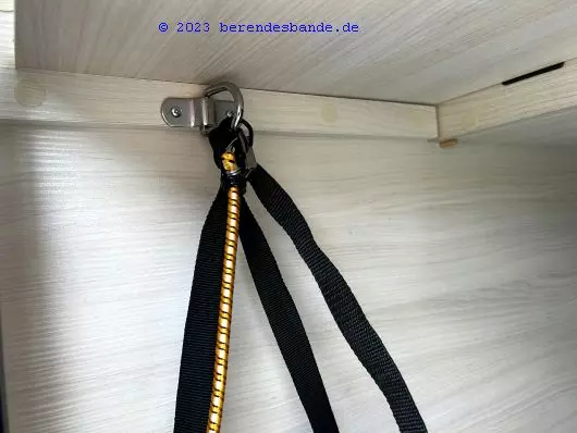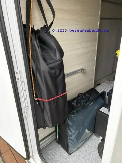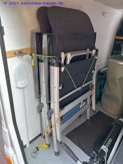 Damit sind wir dann in der Garage. Das Klimagerät ist nahezu mittig in der Garage verbaut. Die nachfolgenden Tipps sind natürlich unseren Bedürfnissen geschuldet, ob dies für andere Camper ebenfalls funktionieren, muss jeder für sich entscheiden. Unsere Campingstühle stehen aufrecht an der Rückwand der Garage, gleich an der rechten Garagentür. Damit die Stühle nicht nach vorne kippen, habe ich eine Holzleiste mit zwei weiteren Zurrösen an der Rückseite verklebt. Darüber hinaus habe ich eine weiter Zurröse am Boden befestigt. Mit zwei Expandergummis bleiben nun die Stühle während der Fahrt an ihrem Platz.