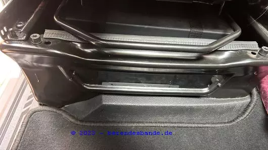 Nach der Schottlandtour im Sommer 23 habe ich noch folgende Arbeiten durchgeführt. Snickers hatte sich seine Verletzung am Beifahrersitz zugezogen. Hier sind scharfe Kanten. Zum einen von oben, direkt unterhalb des Hebels mit dem die Sitzposition verstellt wird. Hier hatte ich mir beim Saubermachen auch schon einen Kratzer zugezogen. Diese Kante wird jetzt durch ein Kantenschutzprofil entschärft. Dann ist von vorne eine trapezförmige Öffnung im Blech. Die Kante ist zwar nach innen gebogen, sie war jedoch die Ursache für Snickers Verletzung, da sich seine Pfote in der Öffnung verhakt hatte. Hier habe ich eine 300 mm x 60 mm x 3 mm Acrylglasplatte auf der Innenseite angebracht. Diese wird durch zwei Schrauben gehalten. Im Blech wurden dafür zwei 4 mm Bohrungen nötig.