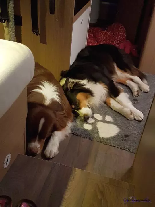 Also wir steigen alle in den Wohnwagen und fahren los. Snickers liegt unter dem Tisch und ich leg mich hinter Frauchens Sitz. Es rappelt und klappert mehr als im Auto, aber wir sind ja früher auch nicht im Wohnwagen gesessen, wenn wir in Urlaub gefahren sind. Mit dem neuen Wohnwagen müssen wir nicht auf einen Campingplatz fahren. Der kann einfach überall stehen. Herrchen dreht dann die Fahrersitze um und schon ist alles fertig. Es gibt auch kein Zelt mehr draußen, wie früher. Deshalb dürfen wir auch nicht einfach rauslaufen, wenn die Türe aufgemacht wird. Wir dürfen erst raus, wenn Frauchen das „Lauf- Kommando“ sagt.