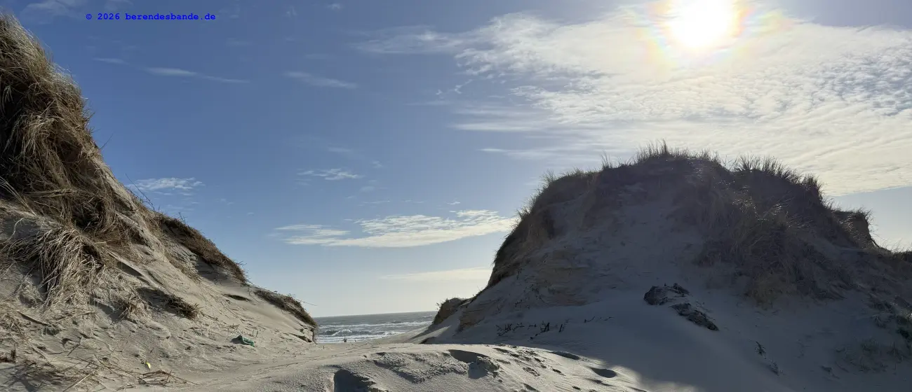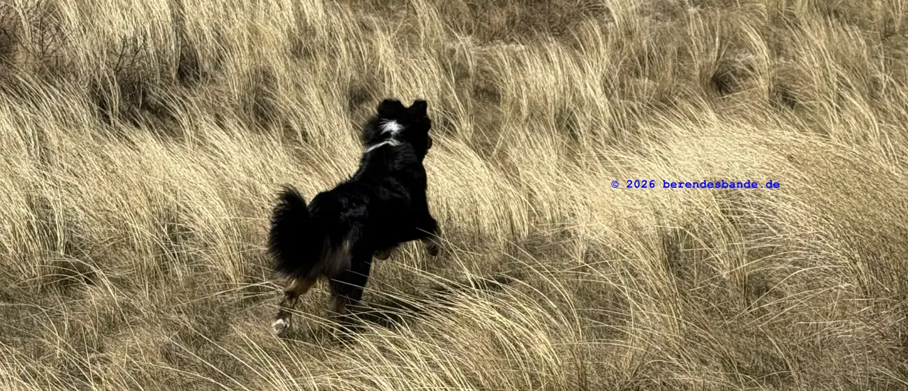Dann kamen wir an eine andere Wiese und da war - niemand. Wir waren da ganz alleine. Gegenüber von der Wiese war ein Zaun, aber Herrchen konnte den Zaun auf machen, damit alle hinter den Zaun kamen. Dann mussten wir einen steilen Berg aus Wiese raufrennen und oben konnte man das Meer sehen, aber es war schon ziemlich weit weg. Auch auf der Wiese waren wir nur einen Tag, aber dann kamen wir auf einen tollen Abenteuerspielplatz. Ich sag euch, das war super. Von unserem Wohungsauto konnten wir sofort auf den Abenteuerspielplatz gehen, nur 100 m an der Leine laufen und dann ging der Spaß los. Da gab es hohe Berge aus Sand und überall gab es kleine Wege. Es roch nach allem Möglichen, Rehe, Mäuse, Hasen, Vögel und auch Füchse. Ich konnte immer die Berge rauf und runter rennen und alle Spuren suchen. Nach zwei so Sandbergen war da das Meer. Das war toll und laut, wegen der Wellen. Wir sind da manchmal spazieren gegangen, aber der Wind hat immer den Sand weggepustet. Das war nicht schön und hat immer in den Augen gekratzt. Der Devil hatte ein ganz doll rotes Auge und musste immer Tropfen ins Auge haben. Deshalb sind wir meistens nur in den Sandbergen gelaufen, wo die vielen Spuren waren. Herrchen hat immer gepfiffen, wenn ich zu weit weggerannt bin, aber manchmal hab ich ihn einfach überhört. Ist keine gute Idee Herrchen und Frauchen zu überhören. Dafür gibt es keine Leckerchen. Dafür komme ich an die Schleppleine. Die ist nur 10 Meter lang und ich kann nicht mehr durch die Dünen düsen. Nach zwei Tagen durfte ich wieder frei laufen. Ich bin dann immer gleich zurückgelaufen, wenn meine Leute gepfiffen haben.