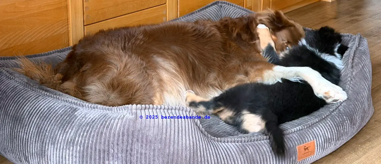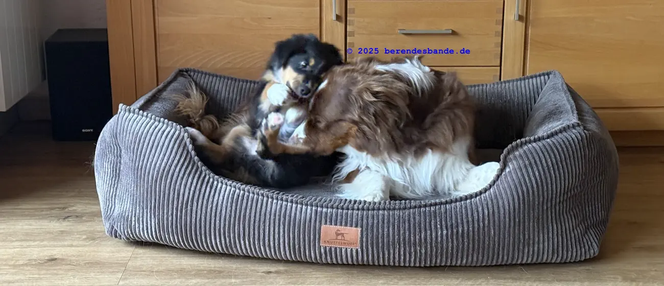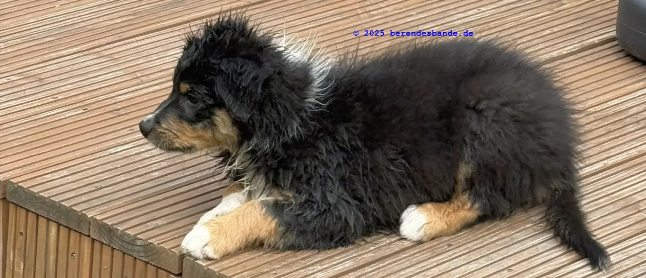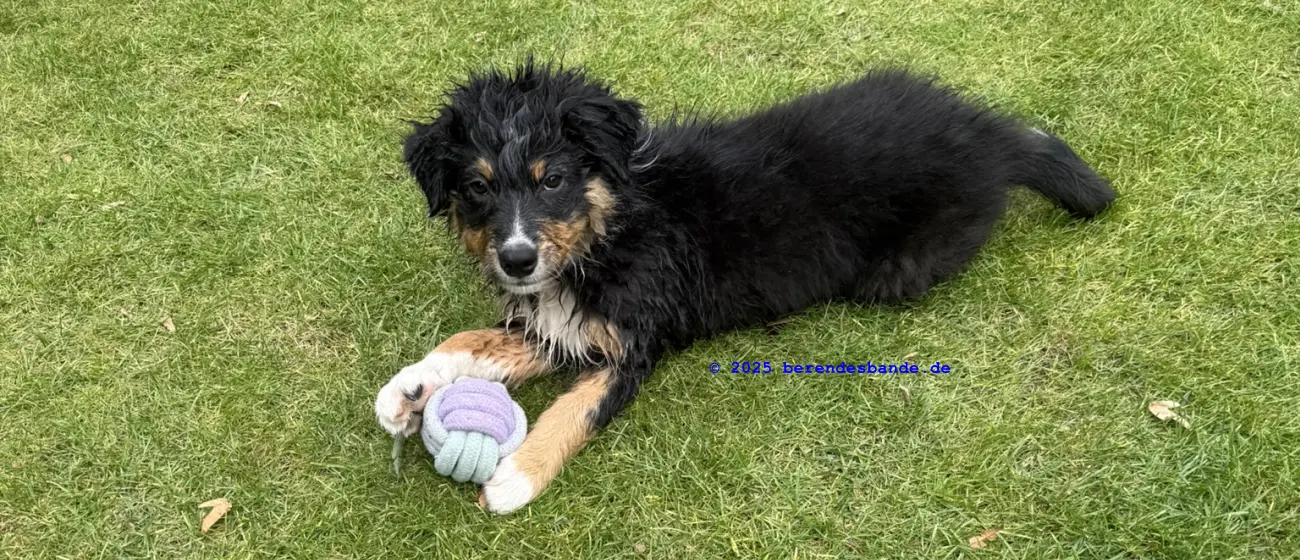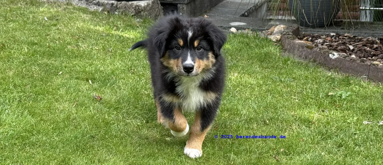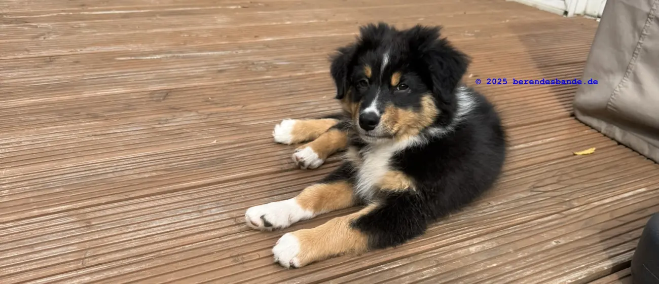Ich gehöre zur Gattung Rüpel, Abteilung Hosenbeinebeißer - oder wie meine Leute sagen, ich bin ein Australian Shepherd Rüde. Ich bin jetzt 10 Wochen alt und wohne seit neustem hier - also bei der Berendesbande. Da wohnen noch Frauchen und Herrchen und der Devil und der Snickers - der sieht fast so aus wie ich, nur ein kleines bisschen größer. Eigentlich ist es ganz cool hier. Mit dem Devil kann ich spielen, Herrchen und Frauchen bringen mir ein paar Kunststücke bei - dabei kann ich auch schon selbst welche. Ich kann die Tischbeine anknabbern, oder die Körbchen von Devil und Snickers, ich kann Blumen aus Frauchens Blumenbeet ausbuddeln und die Blätter aus dem Teich im Garten fischen. Gut, manchmal falle ich dabei in den Teich, aber die Blätter bringe ich trotzdem mit raus. Aber ich glaube diese Kunststücke mögen meine Leute nicht so sehr. Die lernen mir so einen Quatsch wie hinsetzen, hinlegen oder ganz schnell zu ihnen laufen. Zugegeben, diese Dinge machen auch Spaß, besonders weil ich immer Leckerchen abstauben kann, wenn ich es gut mache. Also, für in die Hosenbeine zwicken hab ich noch kein Leckerchen bekommen. Vielleicht muss ich mehr üben, damit es besser klappt.